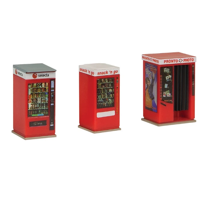 These Concourse Machines will give your layout a modern touch. This pack contains a photo booth and two vending machines of different designs. These machines can be used together or individually not just on station concourses, but also in other locations such bus stations, supermarkets, post offices and town centres.