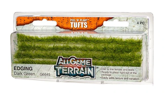 Dark Green Edging is designed to add texture and realism to your terrain feature, miniature base or gaming mat. Dark Green represents grasses in regions with plenty of moisture. Edging can be used along fences and walls to represent over-grown vegetation in abandoned locations. You can also use Edging as barricades. These Tufts are ready to place right out of the package and stick onto your battlefield or gaming mat.